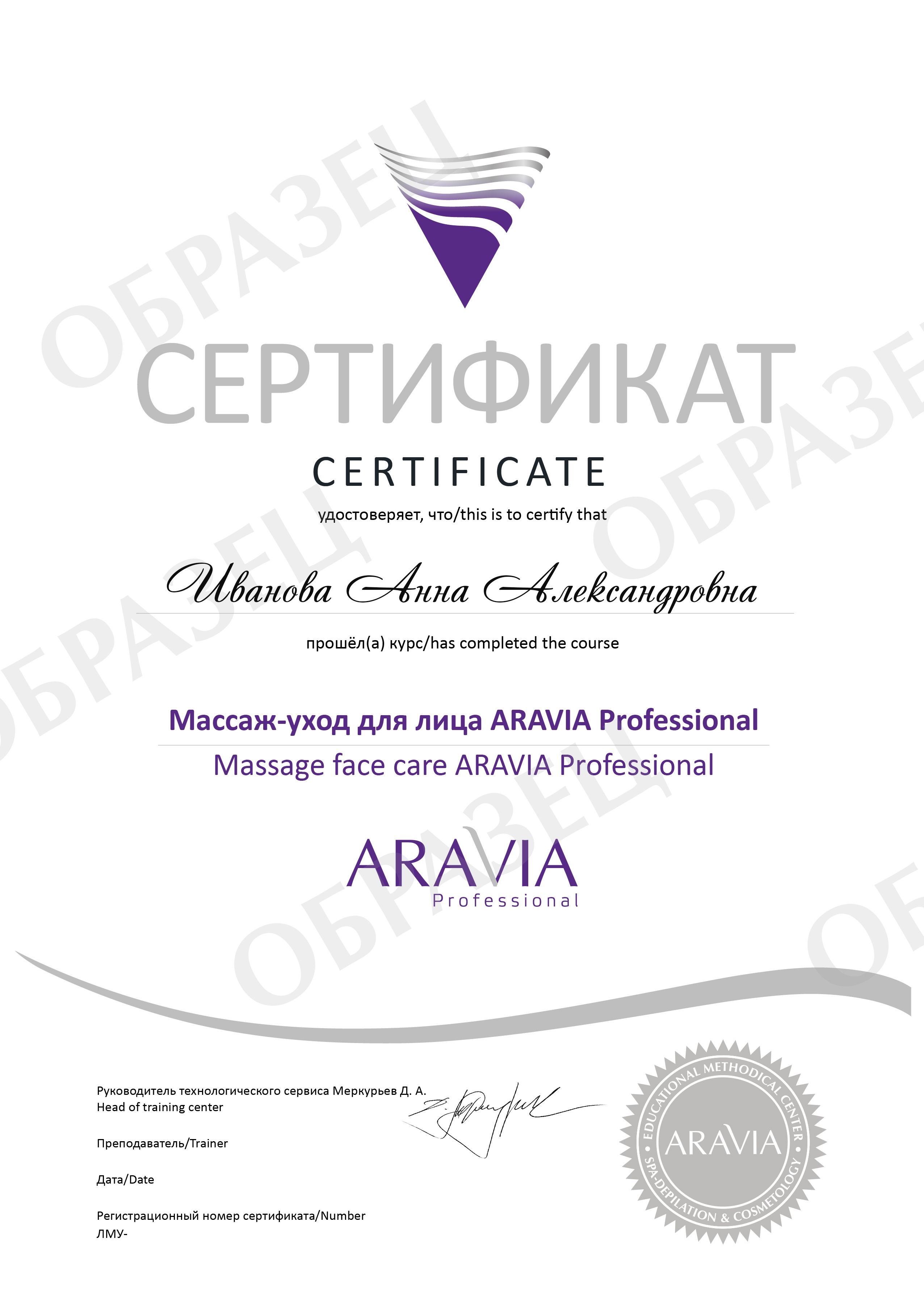 После прохождения курса участники получат методическое пособие косметолога ARAVIA Professional, пособие по массажу, а также именной сертификат о прохождении обучения по направлению «Массаж-уход лица ARAVIA Professional».