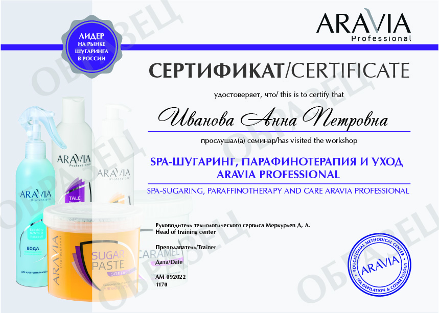 После прохождения мастер-класса участники получат каталоги, прайс-листы и именной сертификат о прохождении мастер-класса по теме «SPA-шугаринг, парафинотерапия и уход ARAVIA Professional».