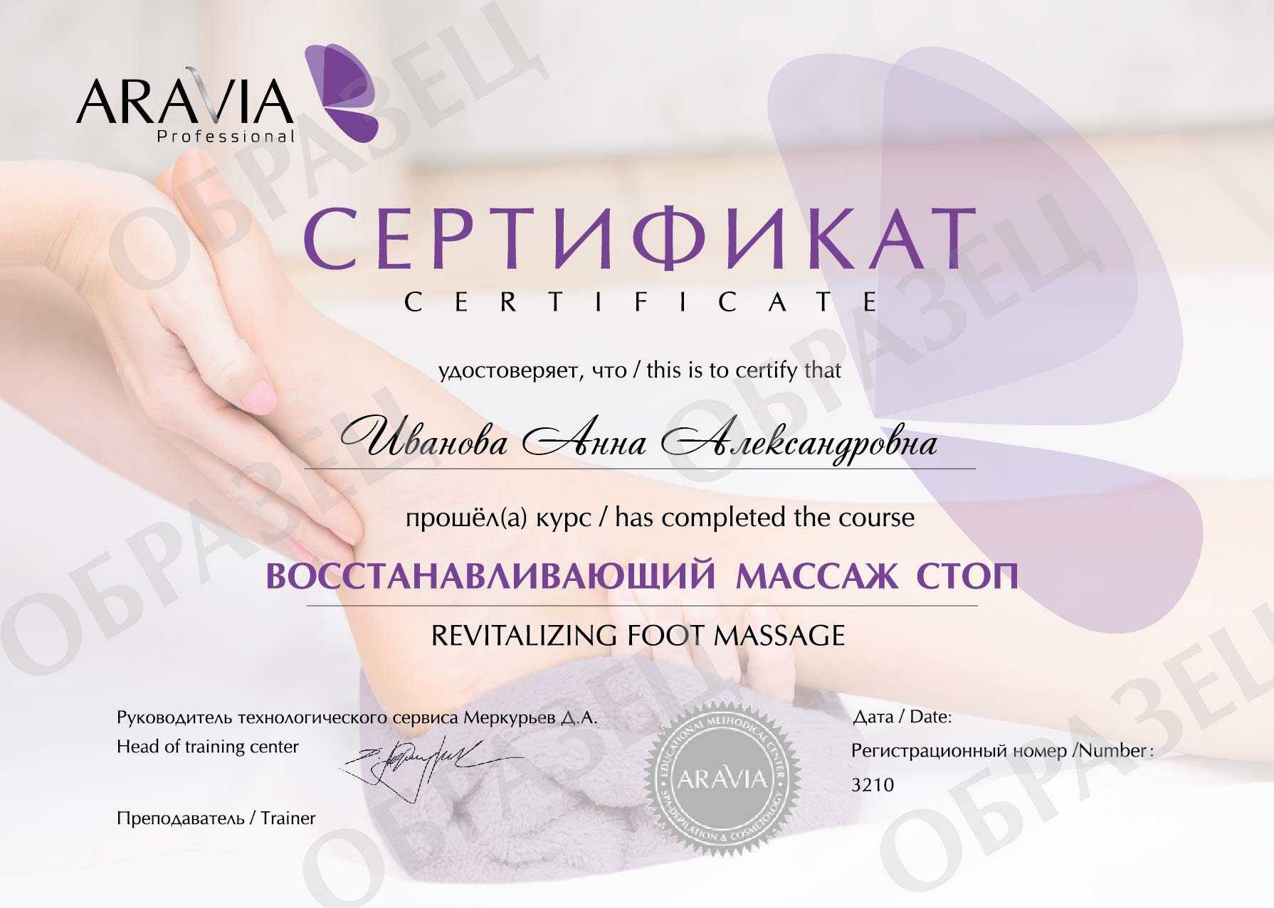 После прохождения курса участники получат прайс-листы, методические пособия, каталоги продукции и именной сертификат о прохождении обучения по направлению «Восстанавливающий массаж стоп». Также мастера получают специальную скидку на весь ассортимент ARAVIA Professional (до 40%).